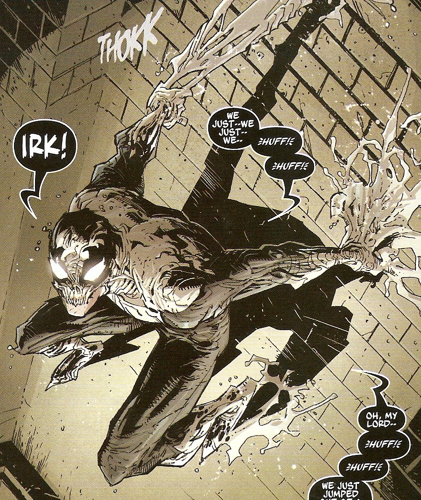 that happens to multiple people at multiple times) is not wearing a costume, but is instead covered in ectoplasm, which swirls over him and protects him from harm. Yes, Todd has basically re-created Venom once again, just designing the character from a 2007 perspective rather than a 1988 one. Todd McFarlane makes Venoms the way evolution makes crabs. Brockinization.